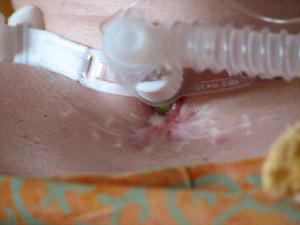 Ich habe nun ums Stoma extrem empflindliches vernarbtes Gewebe und achte immer darauf, dass daran und an der Kanüle so wenig wie möglich manipuliert wird, damit vermeidbare Reize nicht gesetzt werden.
